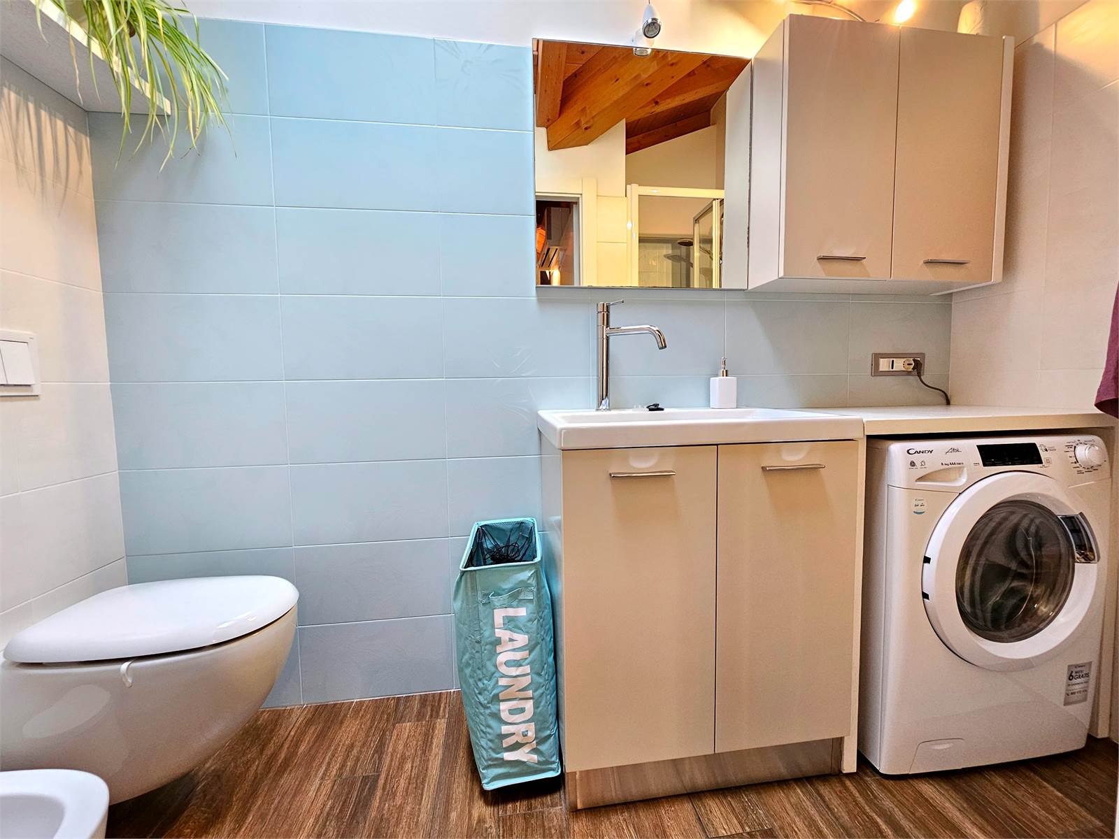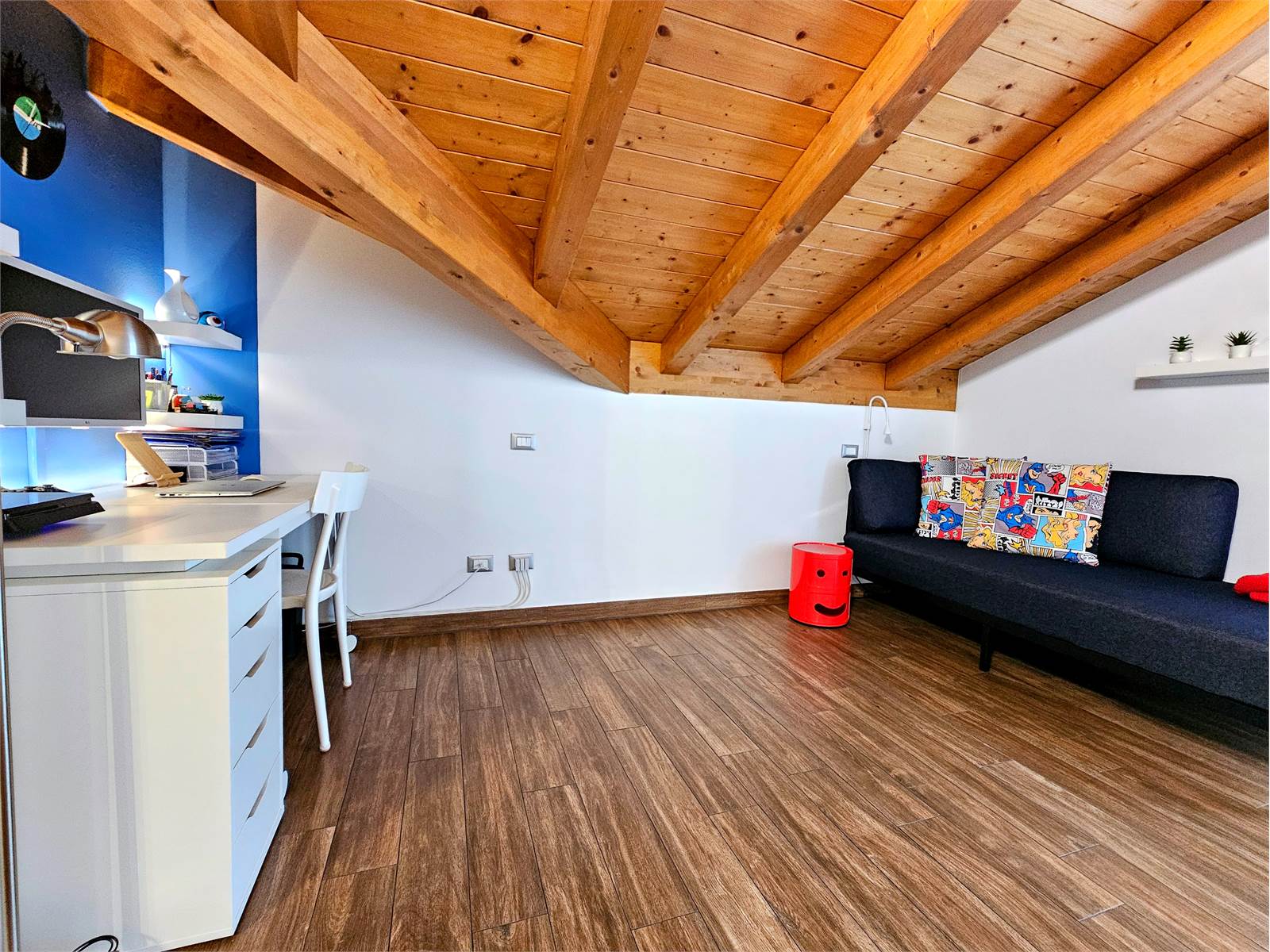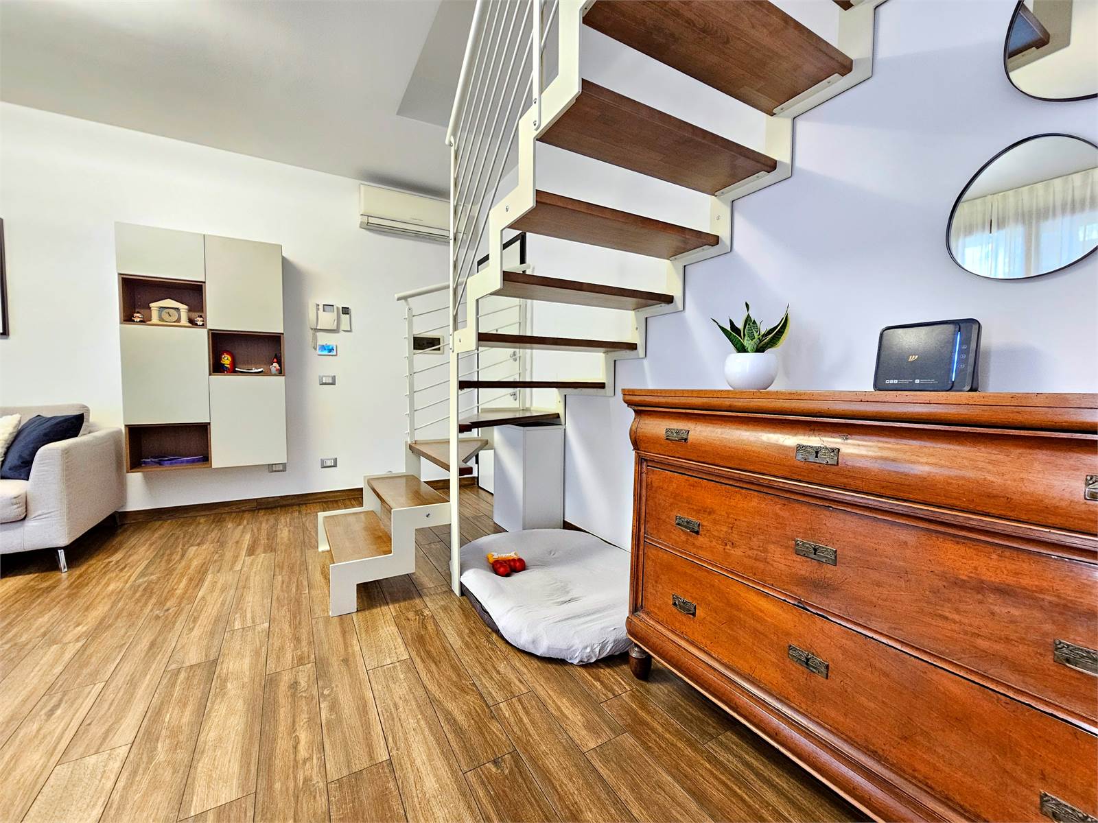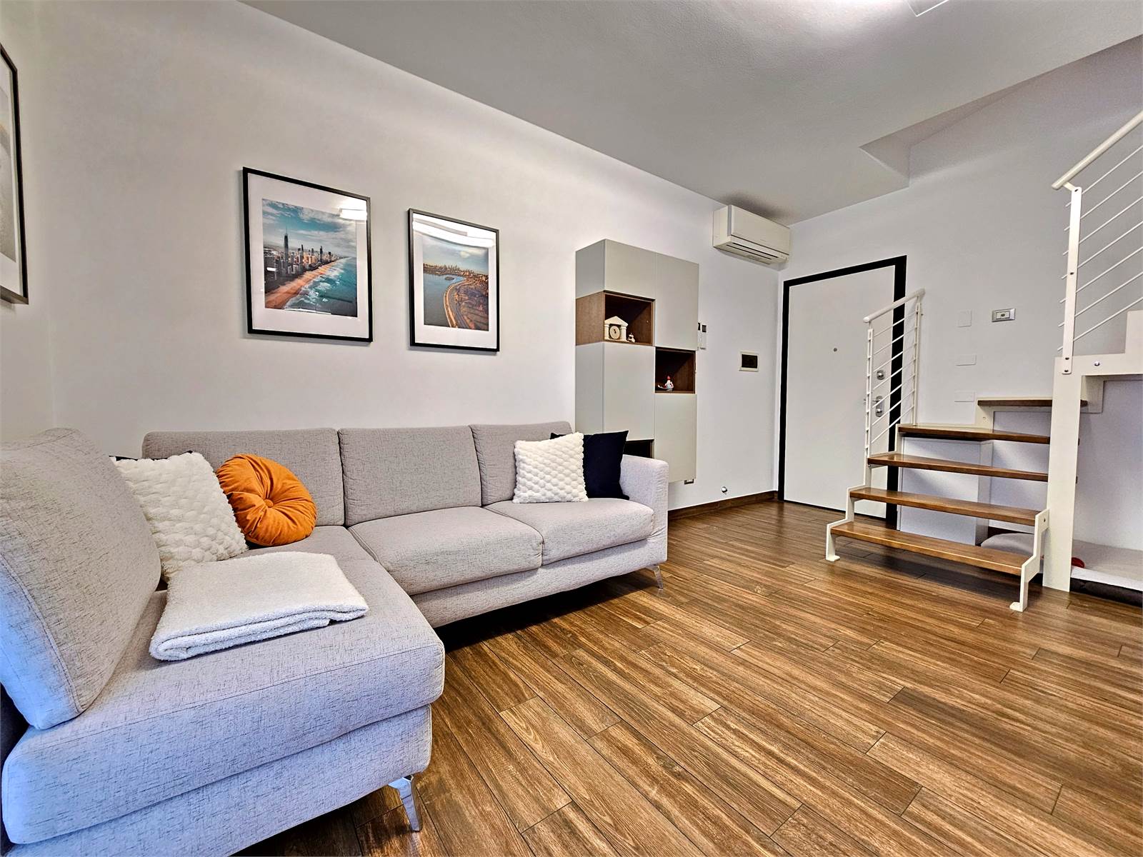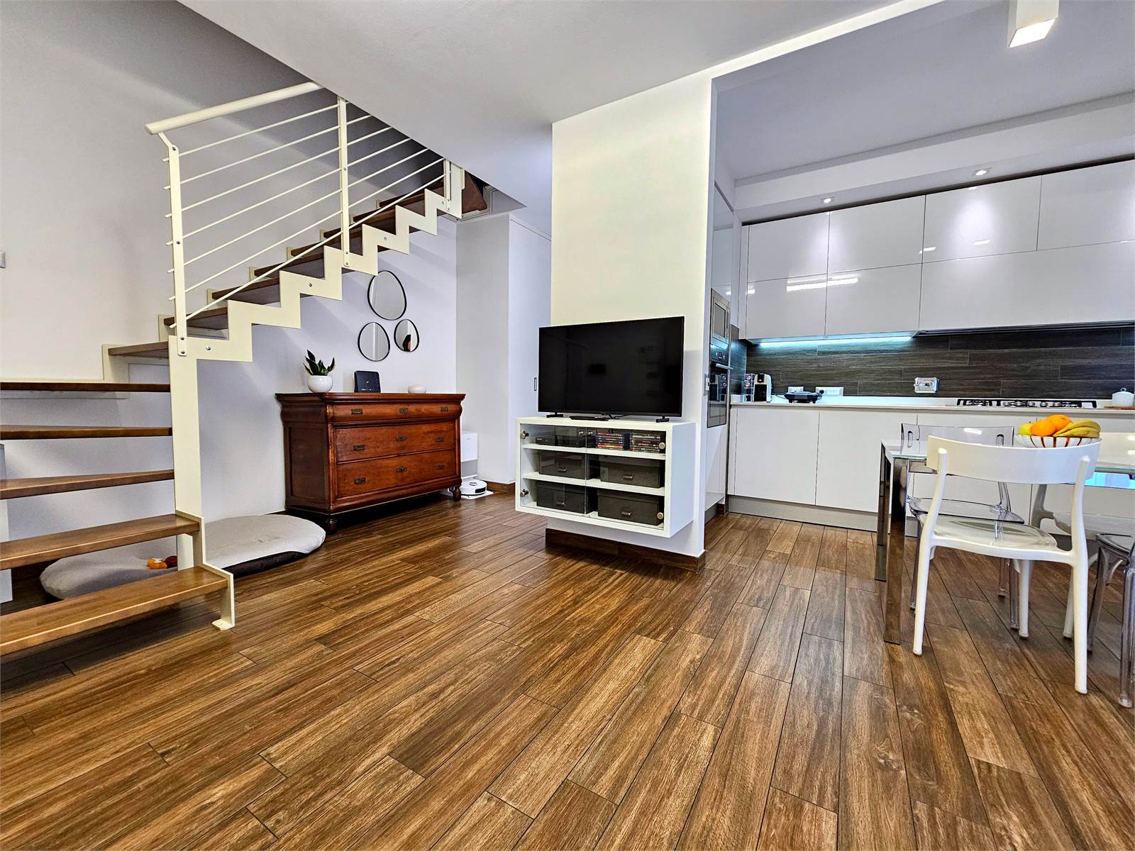 L’appartamento si sviluppa su due livelli: al primo troviamo una zona giorno accogliente con cucina a vista, valorizzata da un terrazzino ideale per colazioni all’aperto, una camera matrimoniale e un bagno elegante.
